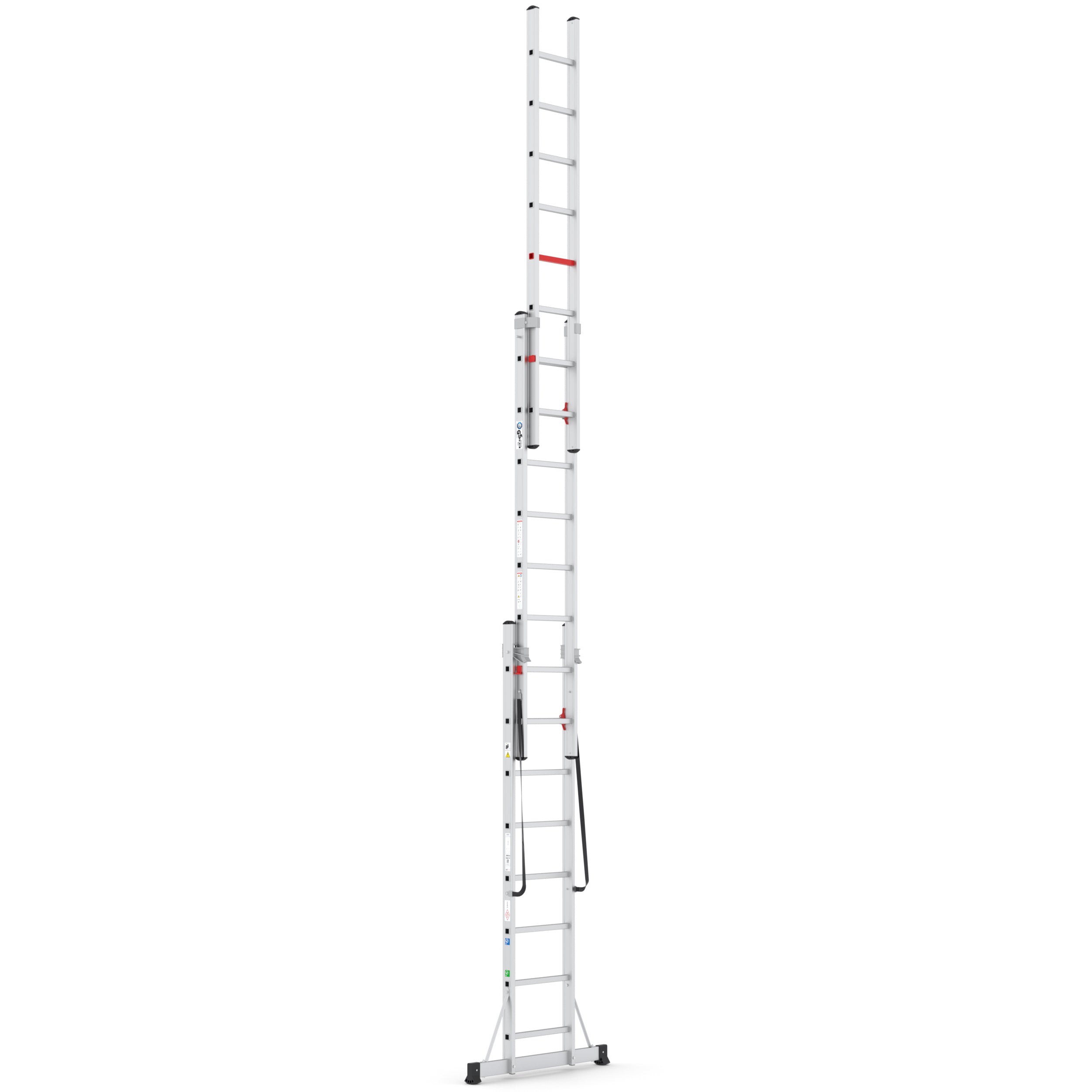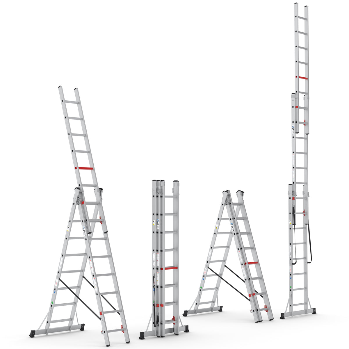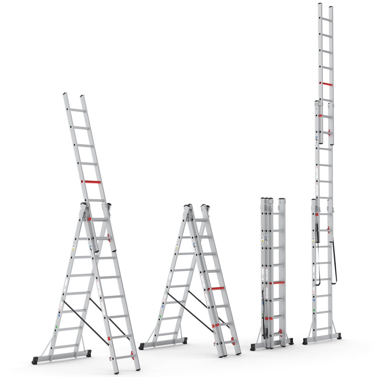 Dank der Möglichkeit, die Leiter sowohl in ausgefahrener Position als auch als A-Leiter zu verwenden, eignet sie sich perfekt für eine Vielzahl von Anwendungen – von Arbeiten an Fassaden und Dächern bis hin zu Einsätzen in Innenräumen.