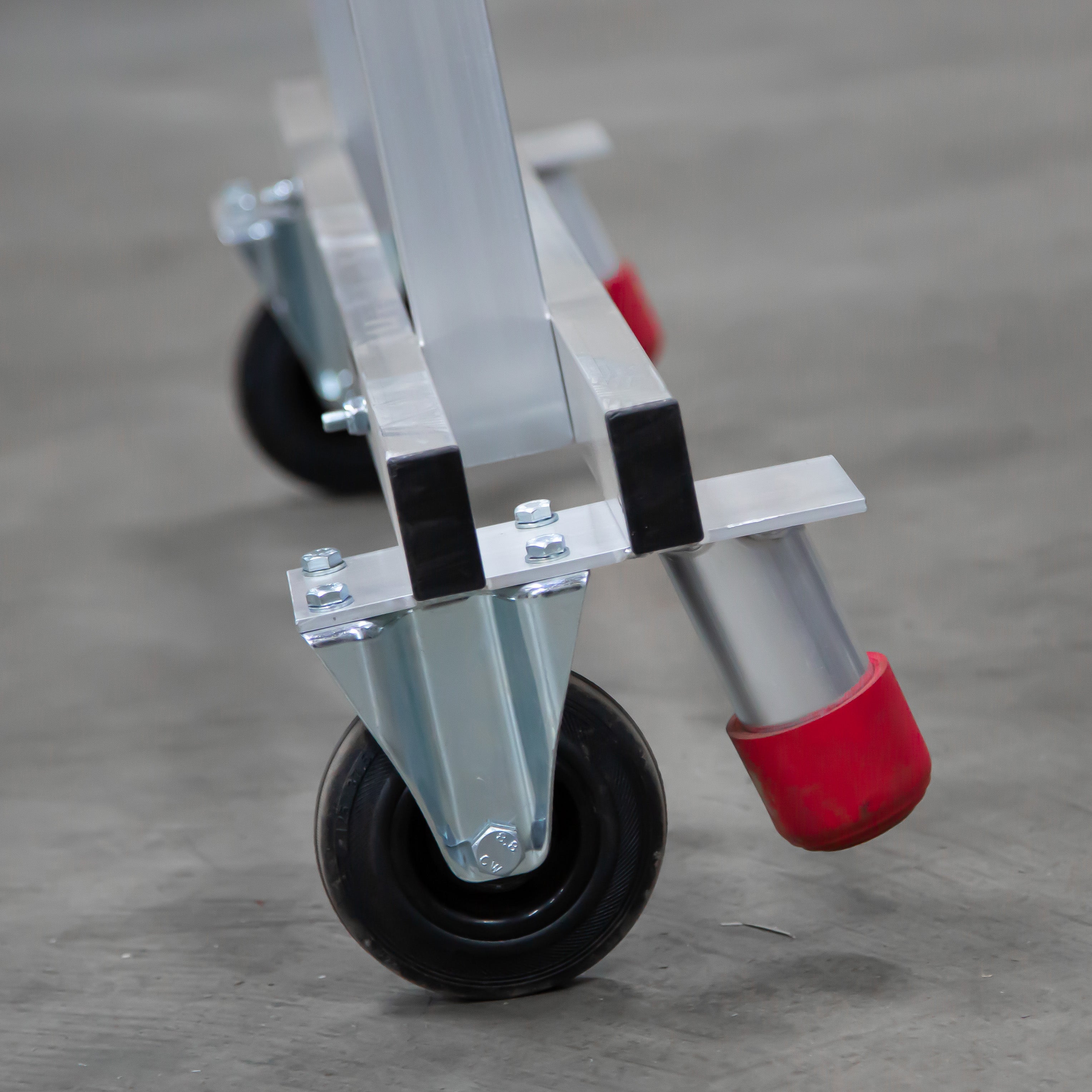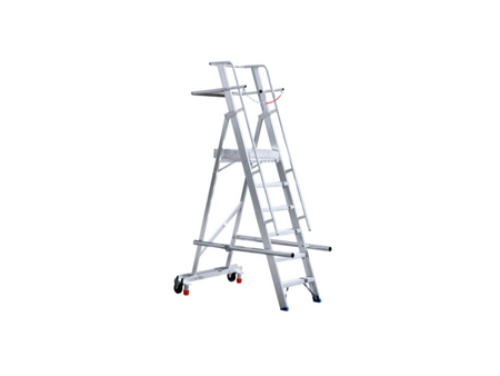 Dank integrierter Rollen lässt sich die klappbare Treppe mühelos bewegen. Durch das dreiseitige Geländer und die stabile Plattform sind Sicherheit und Standfestigkeit auf höchstem Niveau garantiert. Die Treppe entspricht den Normen EN-131 und NEN 2484.