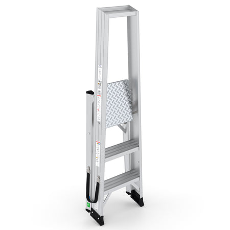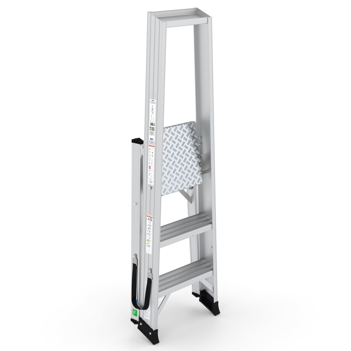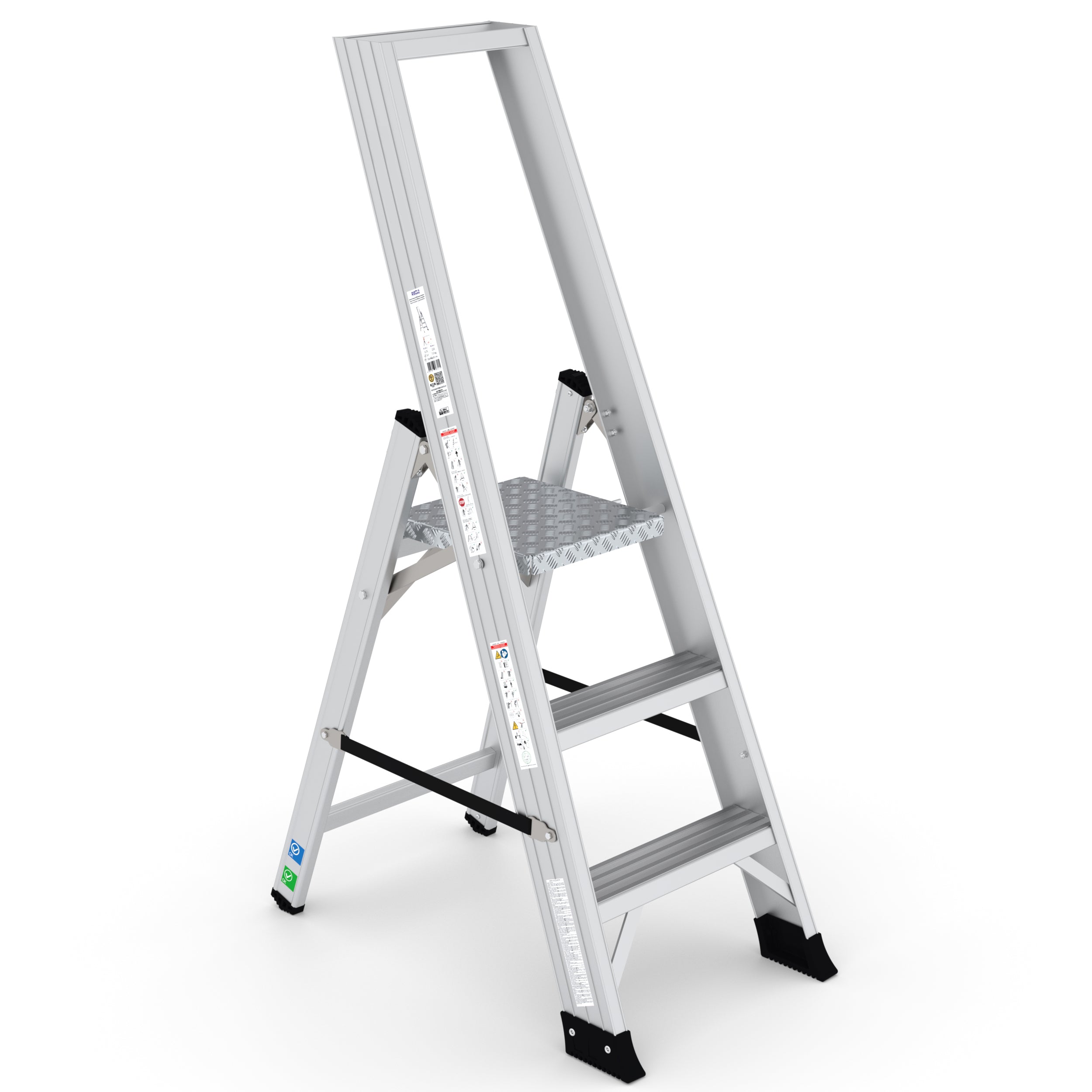 Die rutschfesten Stufen und die verstärkte Aluminiumplattform gewährleisten maximale Sicherheit. Mit der integrierten Werkzeugablage wird jeder Handgriff effizienter, sodass Produktivität und Arbeitskomfort gesteigert werden.