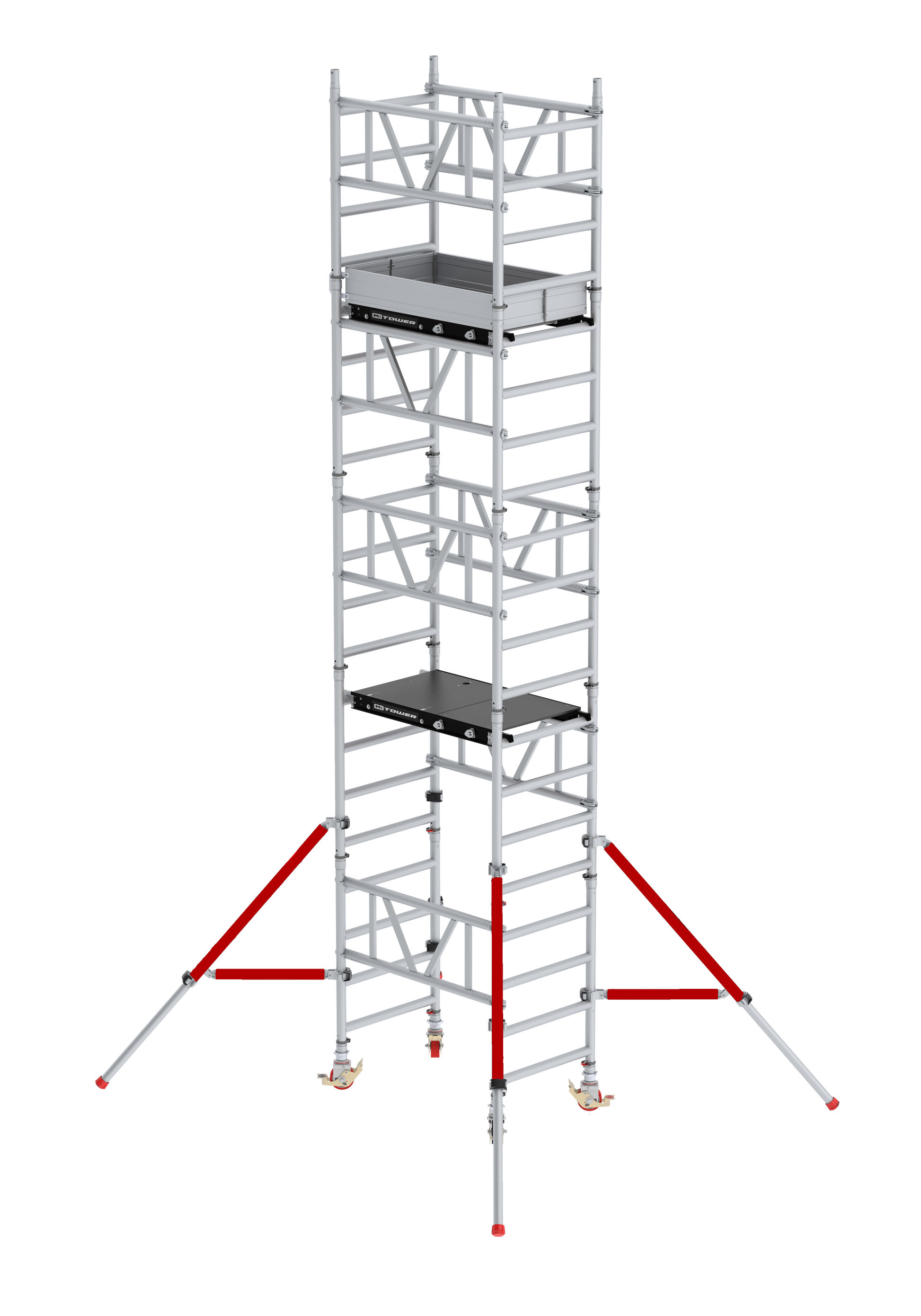 Durch das durchdachte Aufbaukonzept ist die Montage Schritt für Schritt vorgegeben. Das System lässt sich in wenigen Minuten aufbauen und ermöglicht in dieser Konfiguration eine Arbeitshöhe von ca. 6,0 m. Die robuste Konstruktion mit geschweißten Rahmen, Querträgern und doppelt ausgeführten Geländerstreben sorgt für maximale Stabilität.