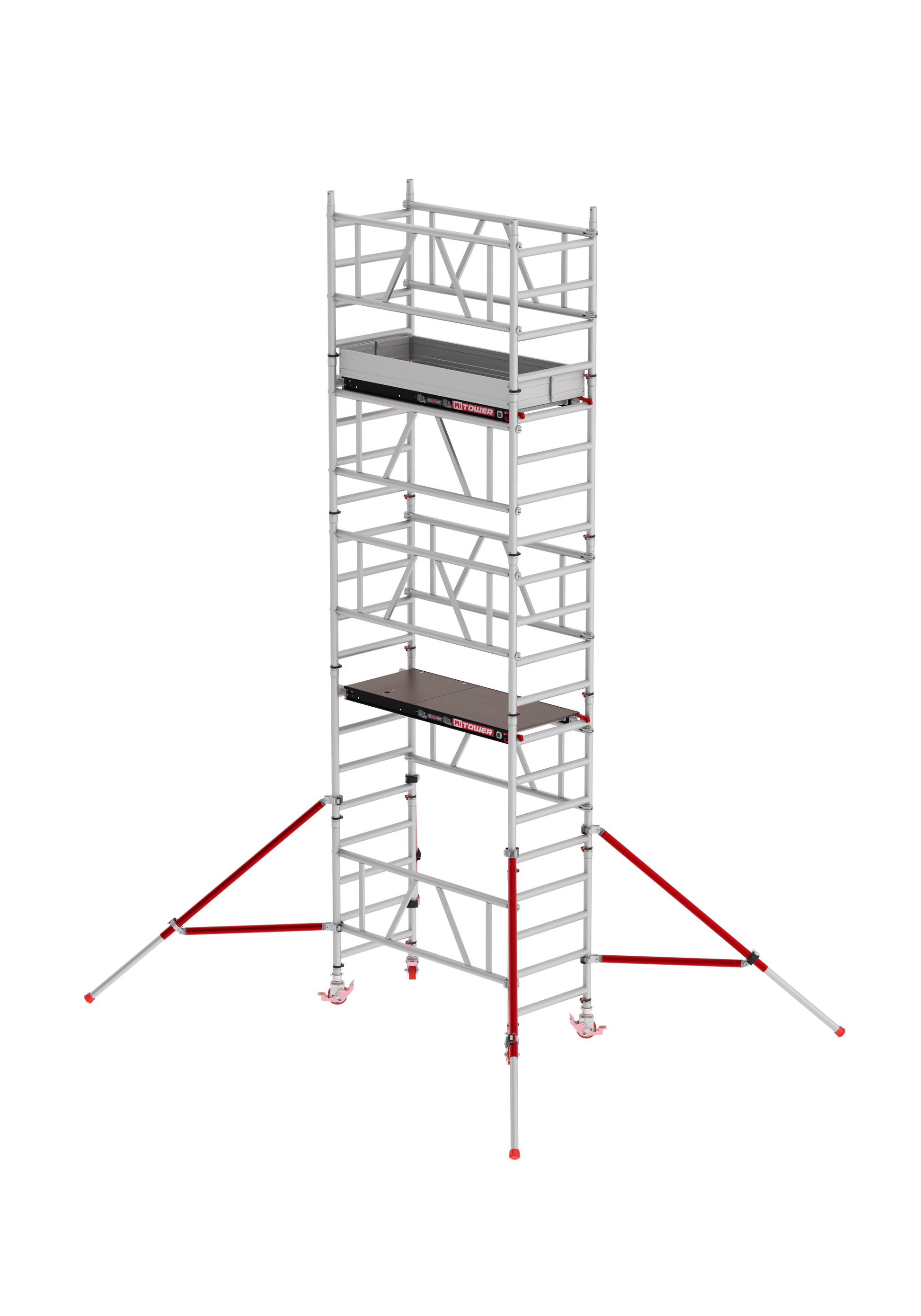 Die maximale freistehende Arbeitshöhe hängt vom Gerüsttyp und den Vorgaben des Herstellers ab. Grundsätzlich gilt: Rollgerüste dürfen im Innenbereich freistehend bis ca. 8 m, im Außenbereich bis ca. 10 m verwendet werden –vorausgesetzt, sie sind standsicher aufgebaut und ggf. mit Ballastgewichten oder Auslegern gesichert. Ohne zusätzliche Sicherungen liegt die freistehende Höhe meist deutlich niedriger, z. B. 2-3-fache Breite der Grundfläche.