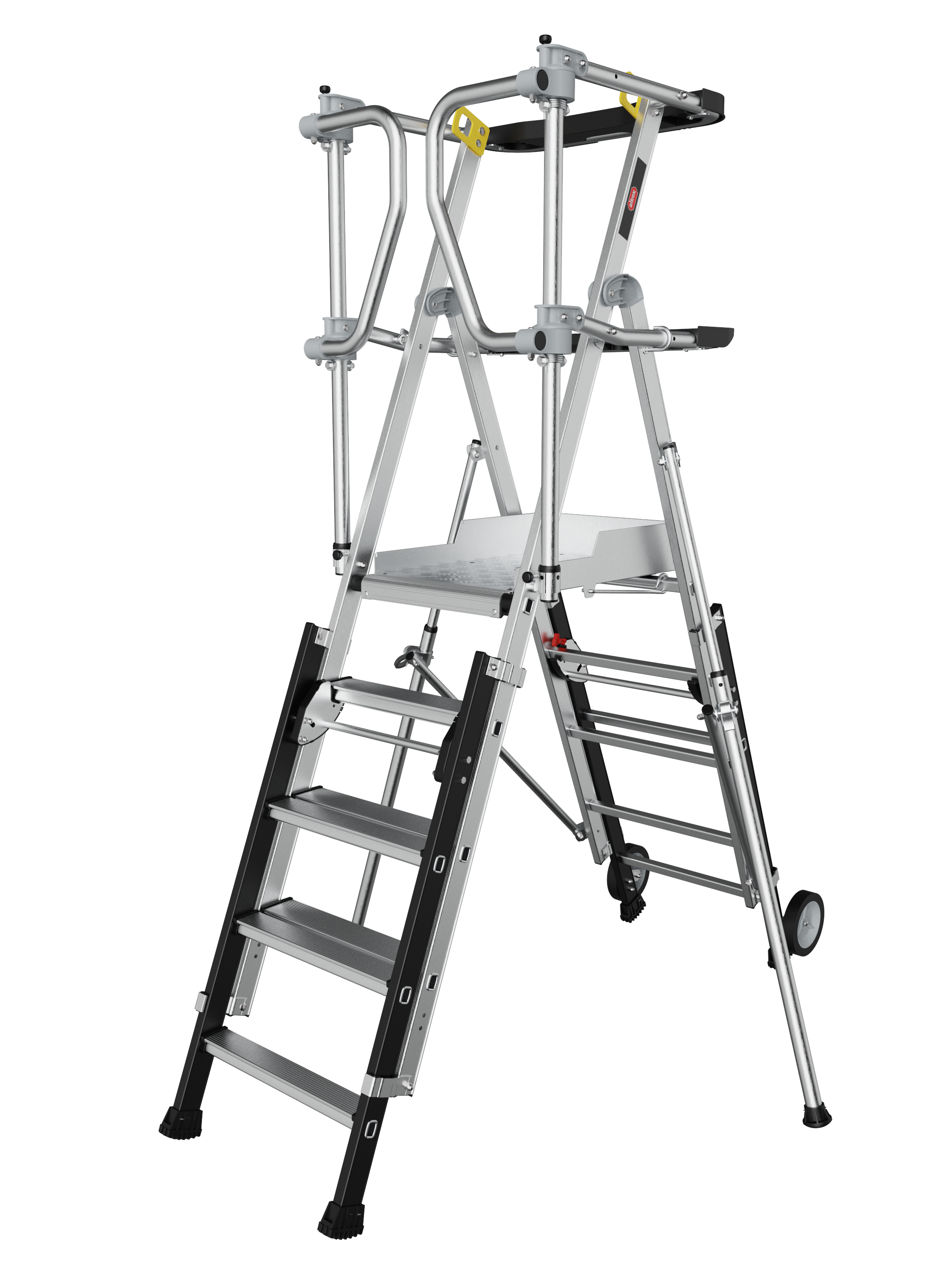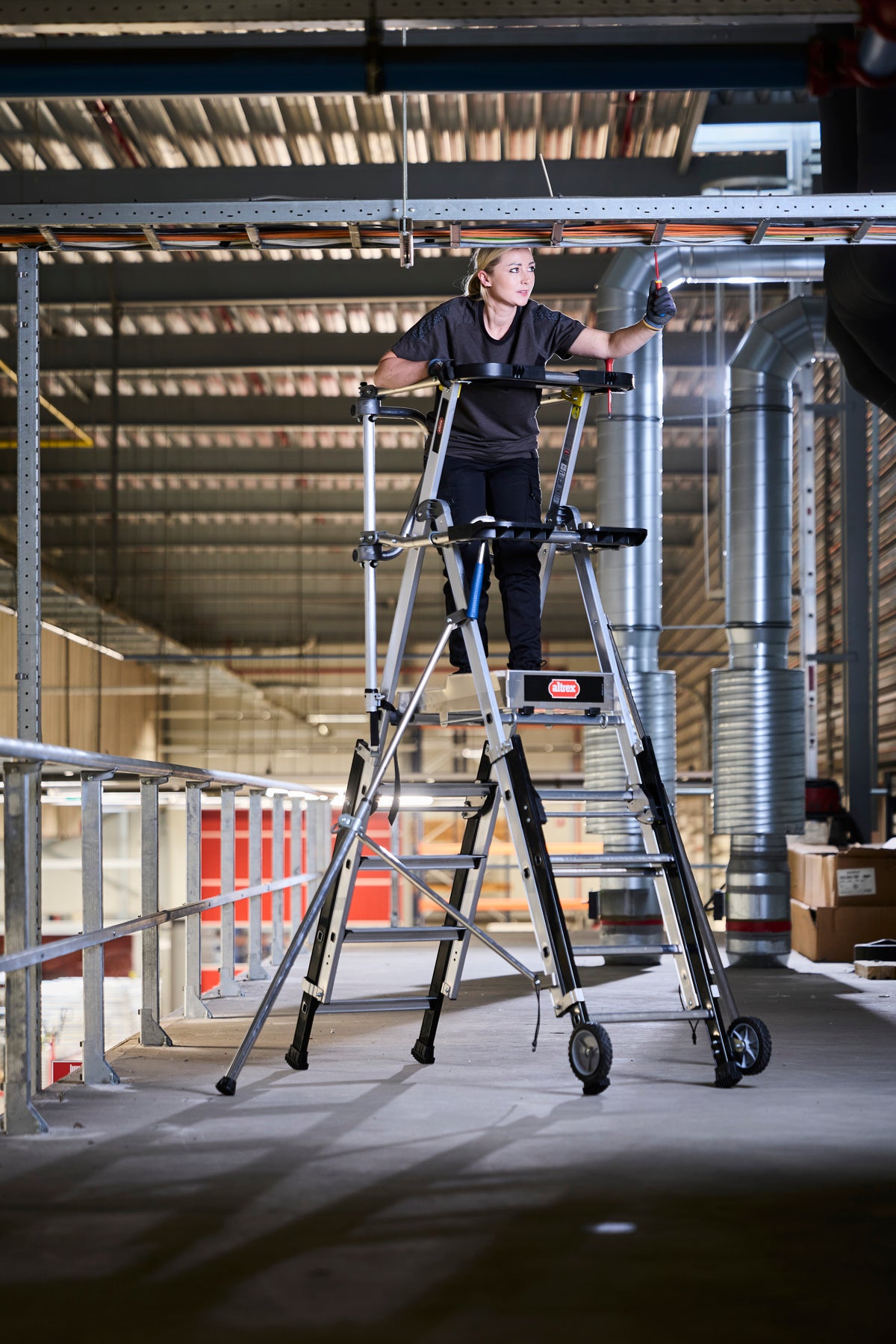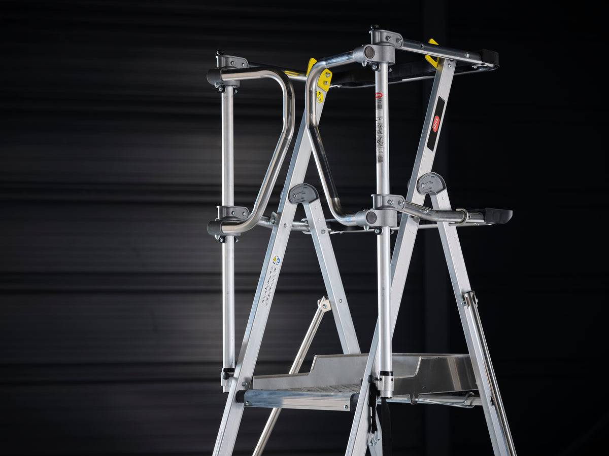 Die großzügige Aluminium-Plattform (60 × 40 cm) sorgt für einen breiten, sicheren Stand. Perfekt für längere Arbeiten wie Montage, Elektroinstallationen, Wartung, Malerarbeiten oder Innenausbau.
