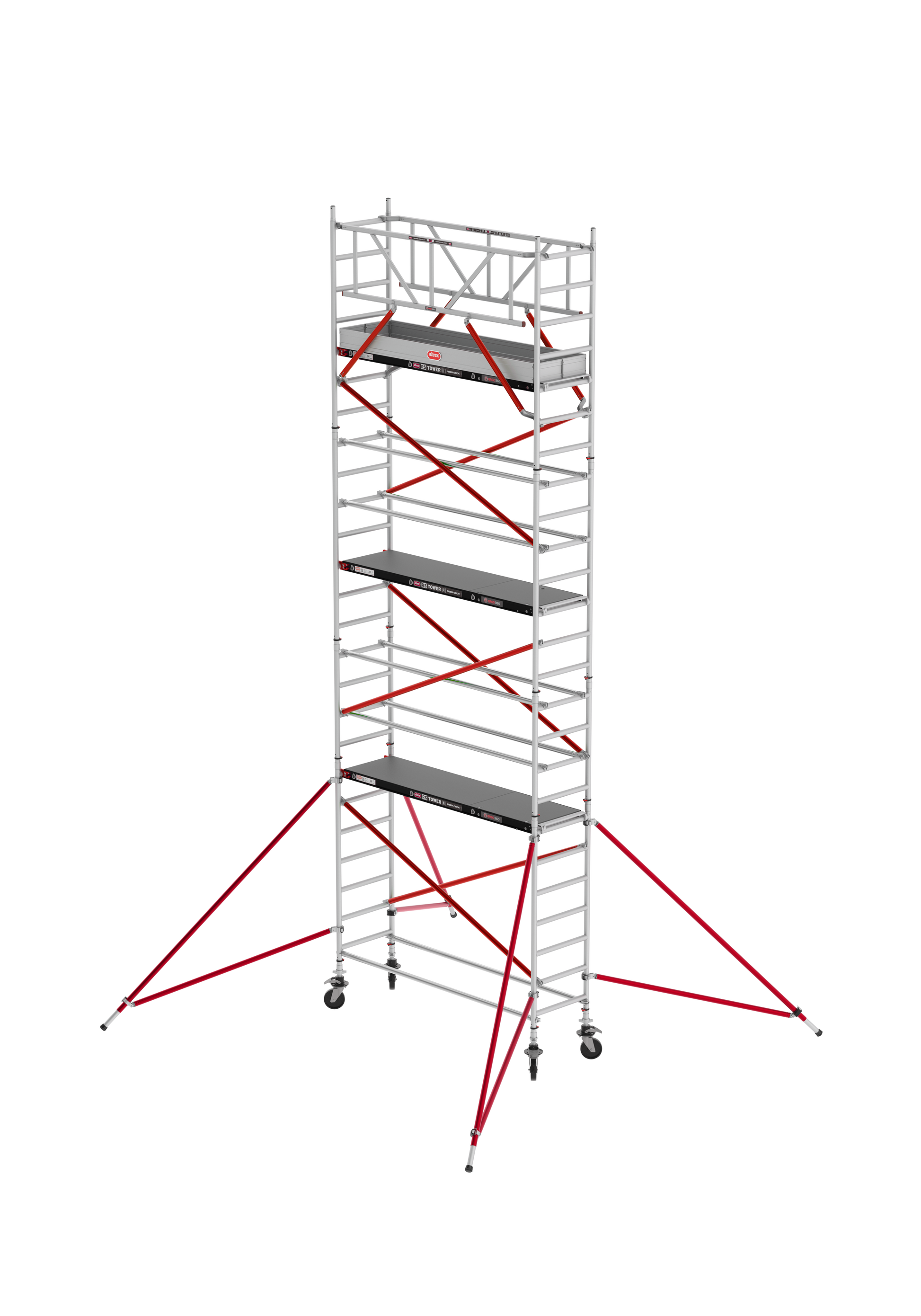 Die maximale freistehende Arbeitshöhe hängt vom Gerüsttyp und den Vorgaben des Herstellers ab. Grundsätzlich gilt: Rollgerüste dürfen im Innenbereich freistehend bis ca. 8 m, im Außenbereich bis ca. 10 m verwendet werden –vorausgesetzt, sie sind standsicher aufgebaut und ggf. mit Ballastgewichten oder Auslegern gesichert. Ohne zusätzliche Sicherungen liegt die freistehende Höhe meist deutlich niedriger, z. B. 2-3-fache Breite der Grundfläche.