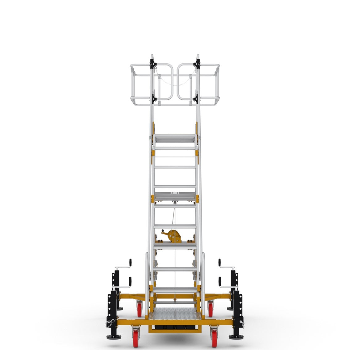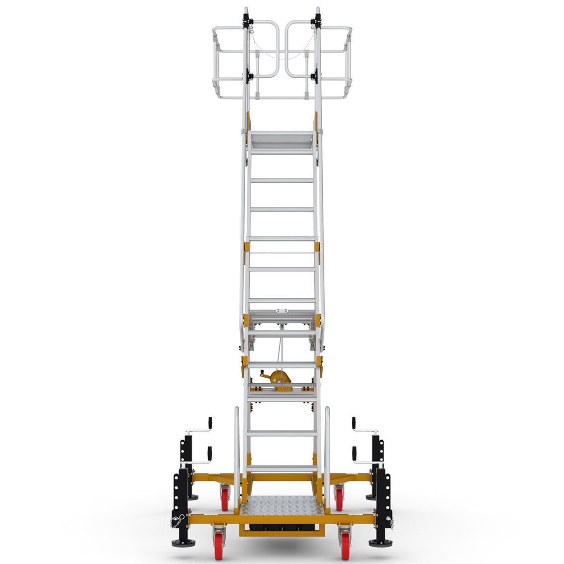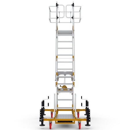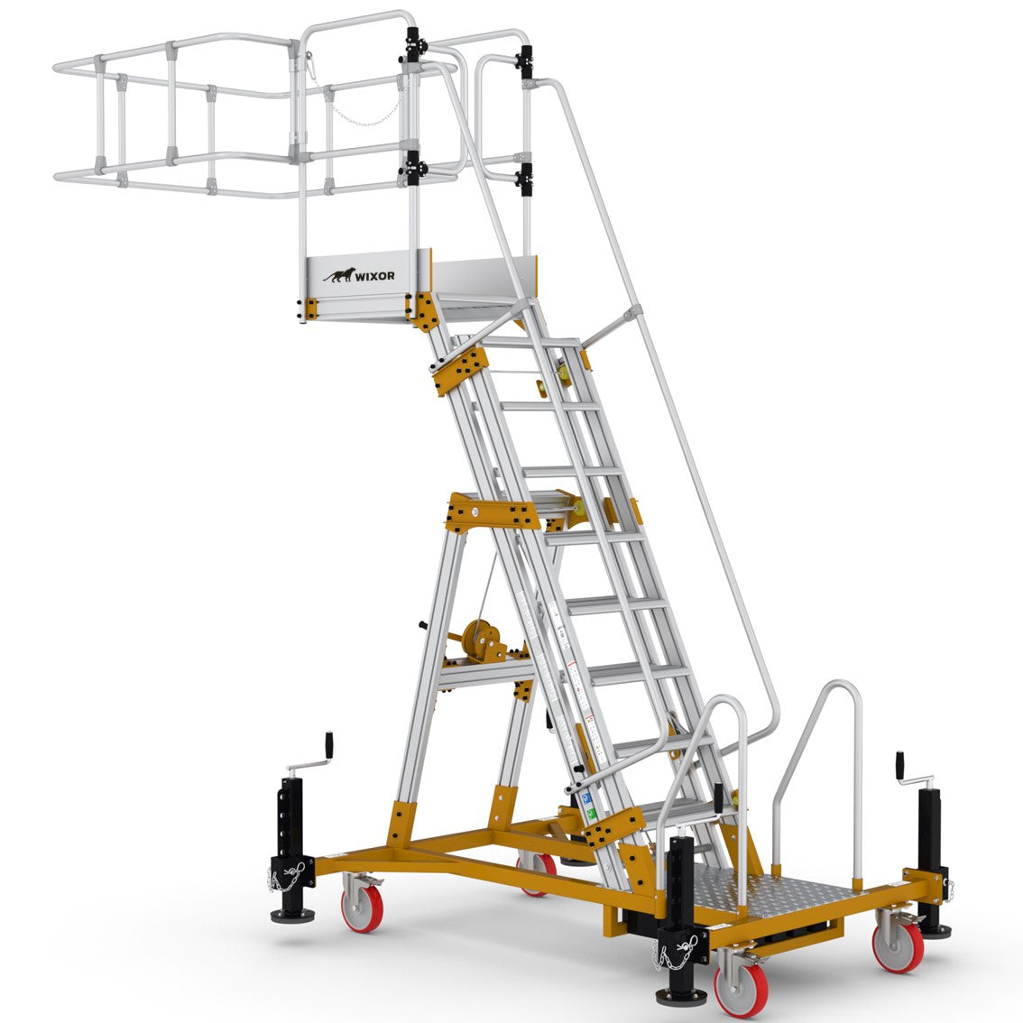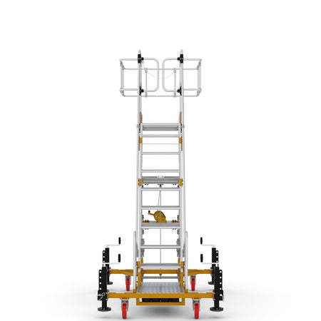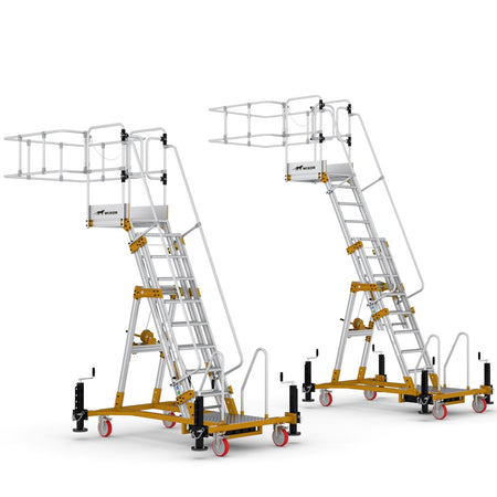 ✅ Maximale Sicherheit: Umlaufendes Geländer mit Knie- und Hüftschutz, rutschfeste Stufen und ein stabiler Handlauf garantieren sicheres Arbeiten.